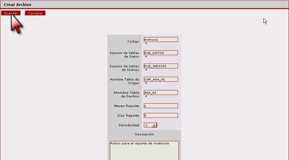 Para almacenar los datos digitados se hace clic en el botón “Guardar” o si no se desea realizar la creación, se hace clic en el botón “cancelar” y nos devuelve a la pantalla principal de archivo. Mostrando el archivo creado.